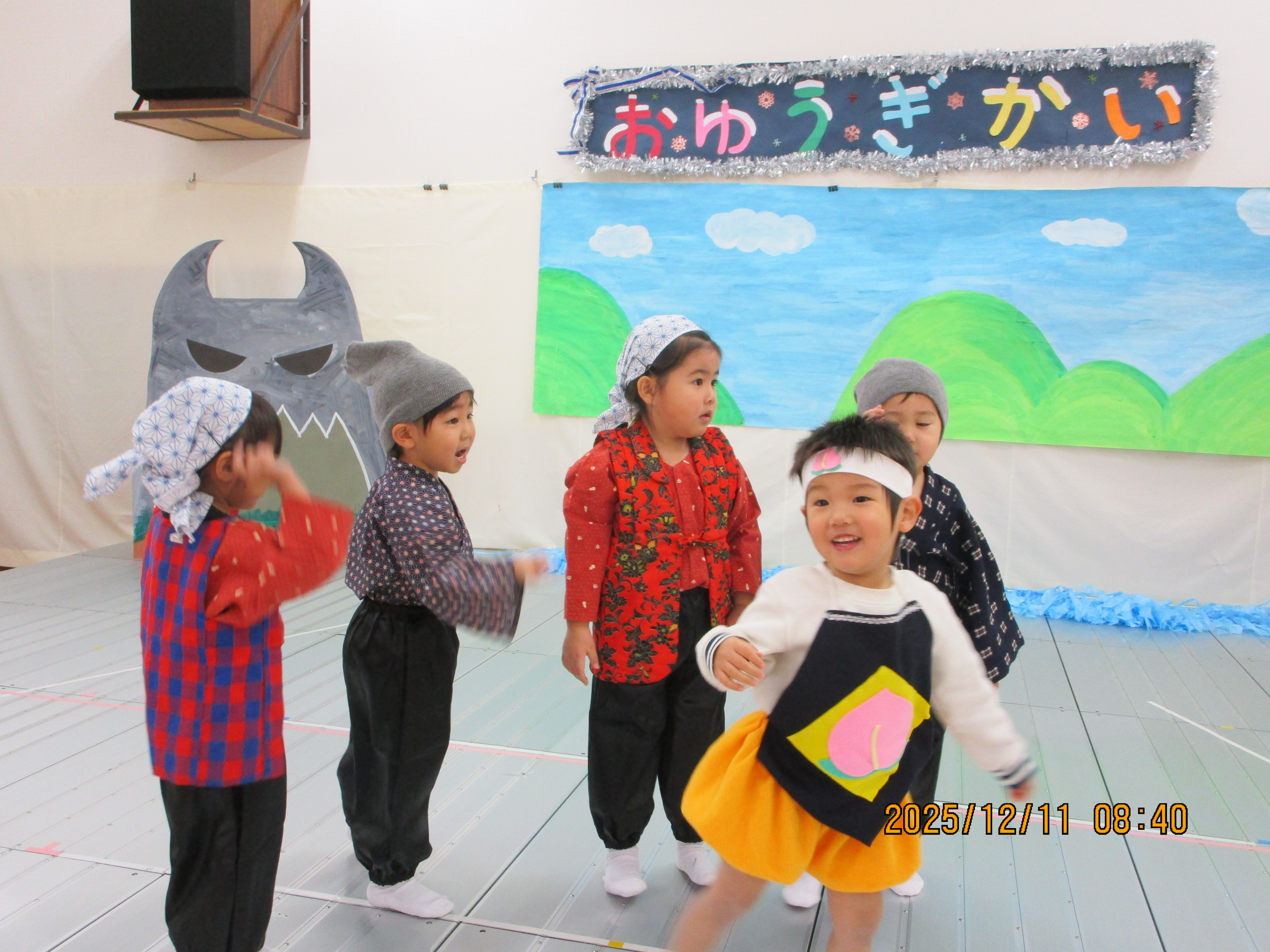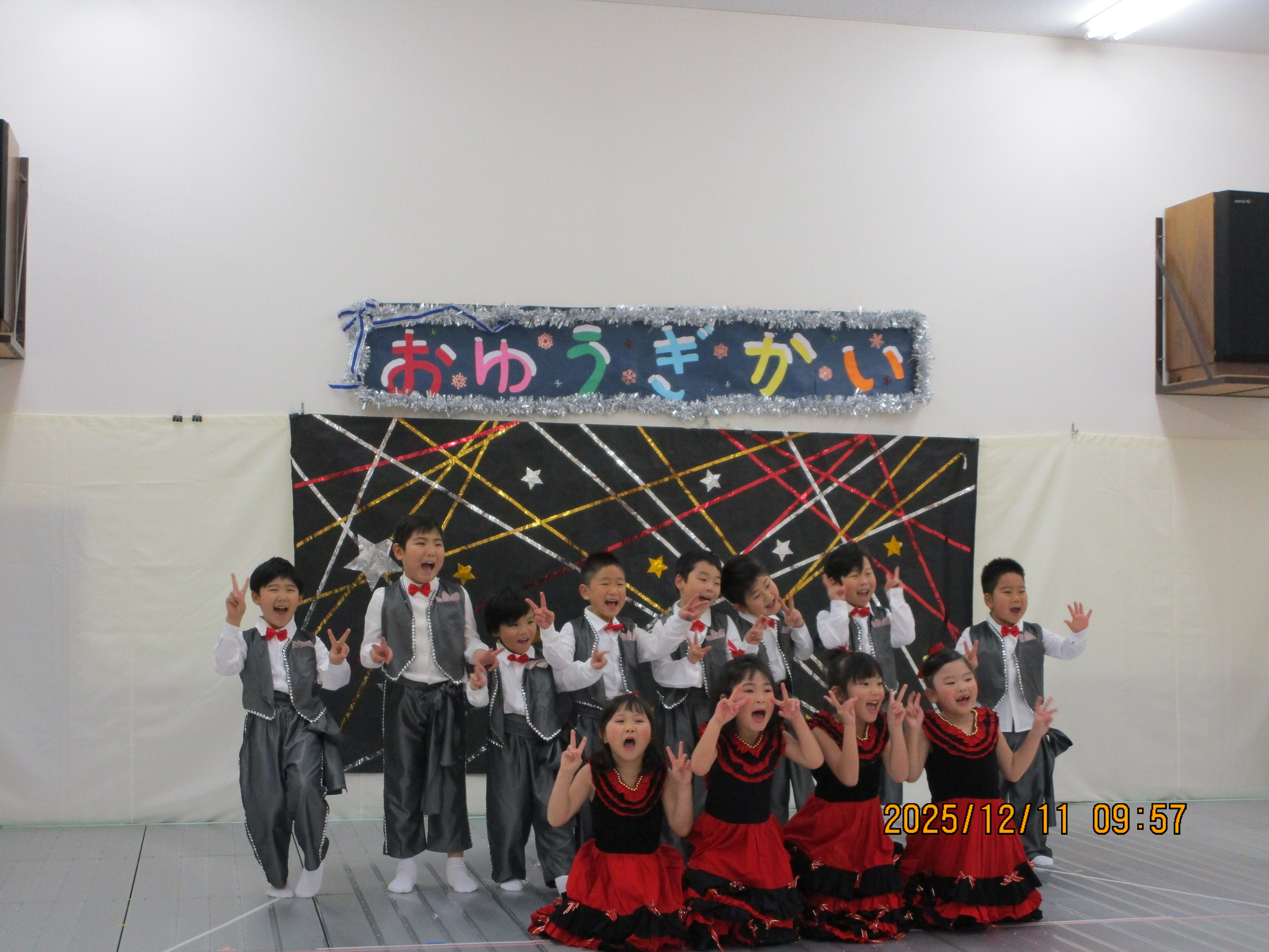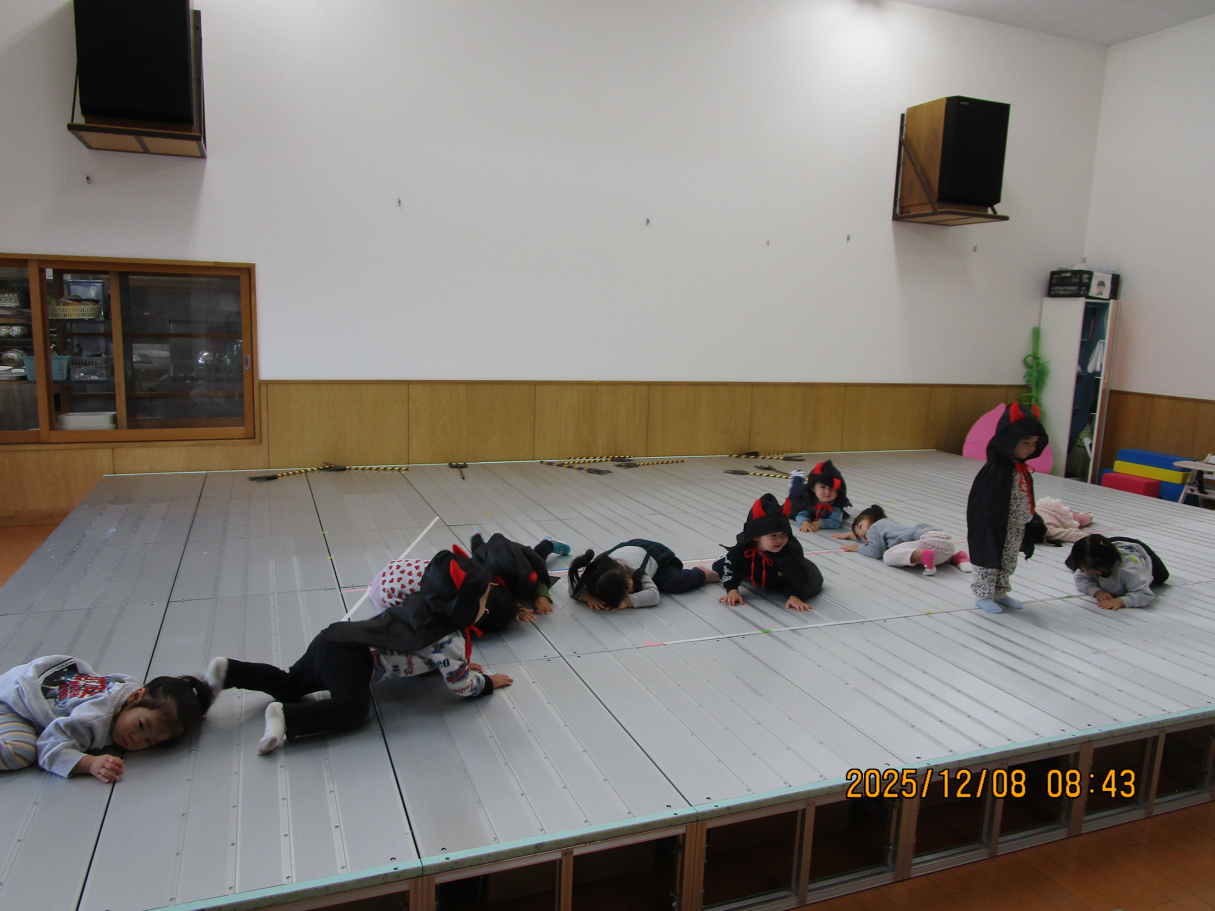 何週間も前から練習をして無事本番を終えることができました。当日はたくさんの保護者に見守られる中、緊張した子どもたちも多かった様子でしたが、同時にプレッシャーの中お遊戯や劇を楽しんで行っているようにも感じられました。最後のサンタさんからプレゼントを受け取る子どもたちを見ていて、今まで以上に満足感や自信が備わったように見られました。お遊戯会の衣装の準備や本番当日など協力して下さった保護者の方々ありがとうございました。