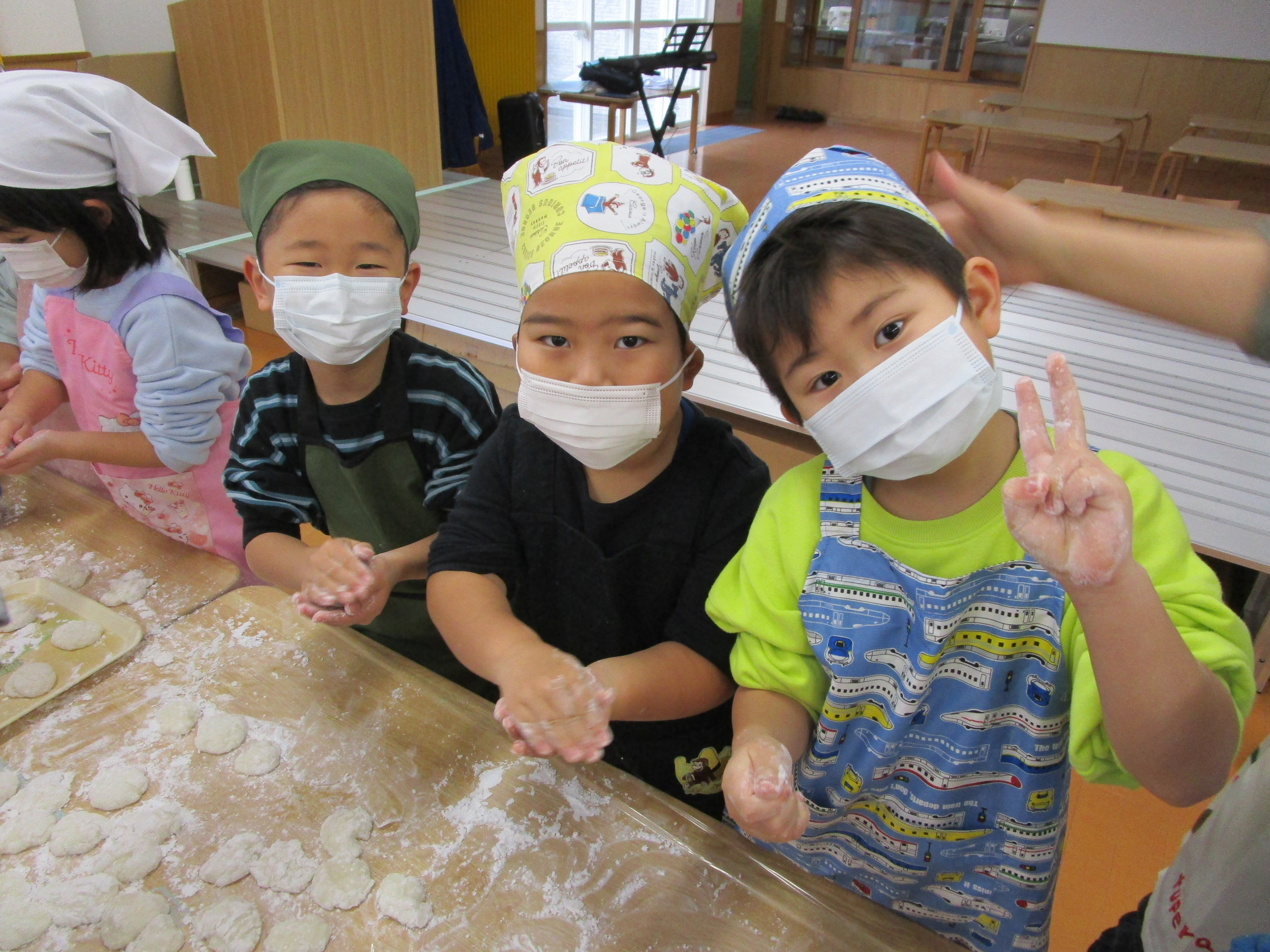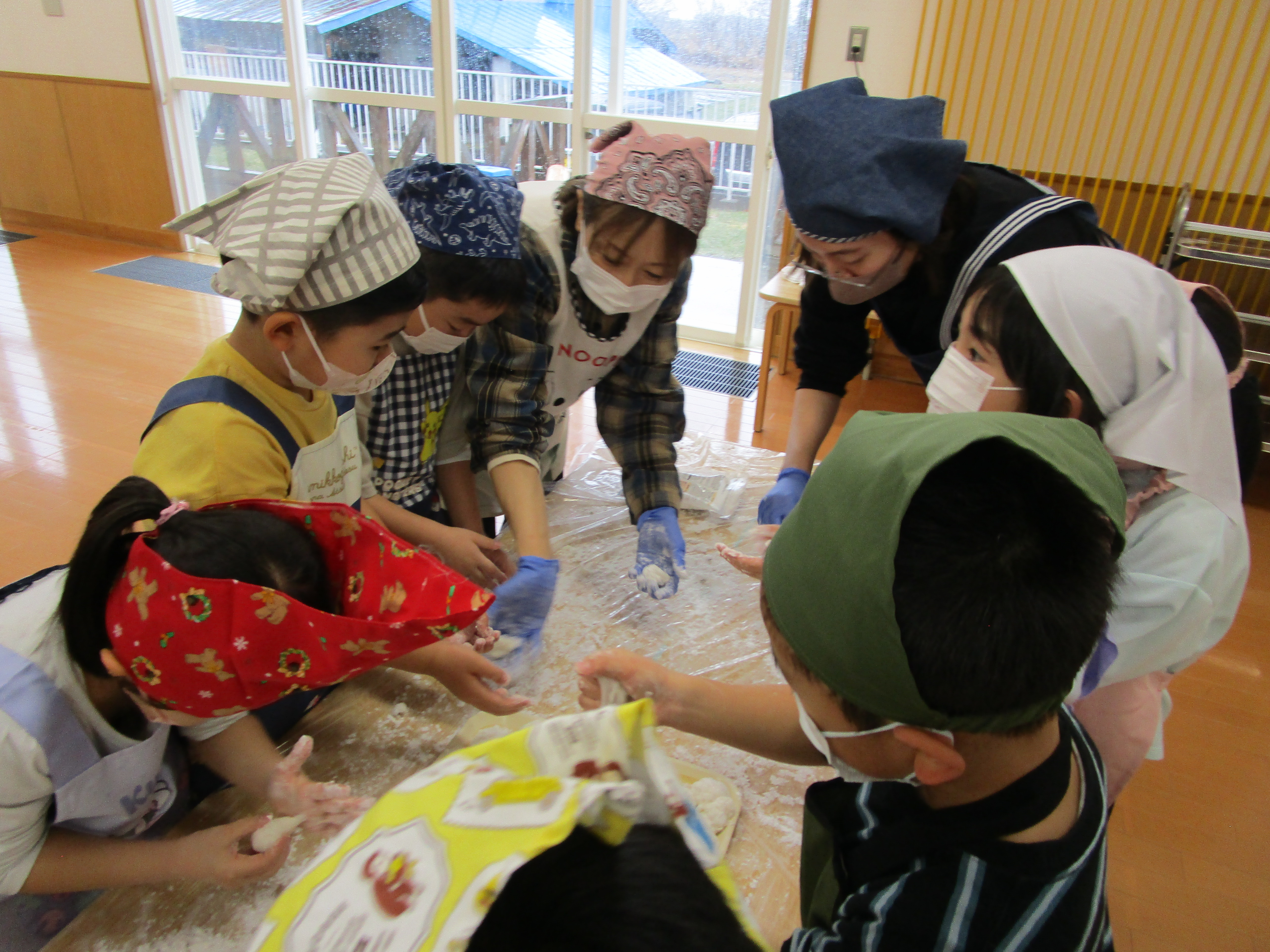 当日はあいにく雪の降る日でしたが、希望のあった卒園児の保護者の方にも参加してもらい餅つき会を行いました。そら、にじ組はつきたての餅を一口大に丸める作業に挑戦しましたが、手袋にくっつくのがなかなか難しいようでした。給食の時間、やっぱり自分たちで作った餅はおいしいようで味を変えて何回もお代わりする子もいました。