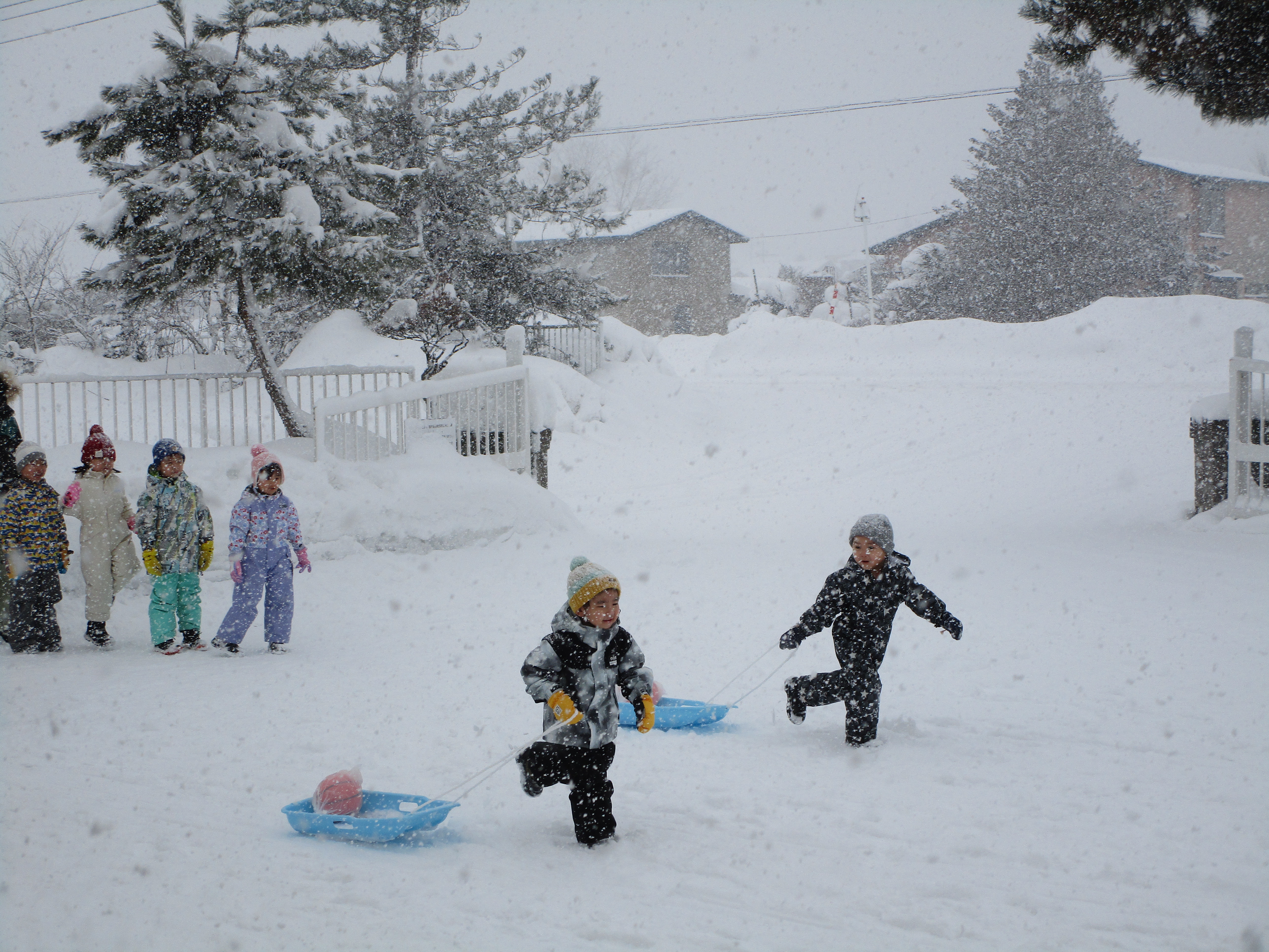 毎日雪が降りとても寒い日が続いていますが、毎年恒例の雪遊び会を行いました。吹雪のため今年は運動場でなく園庭で、時間短縮で行いましたが、なかなか思い切り体を動かせなかった分子どもたちは元気いっぱいに走り回り楽しんでいました。